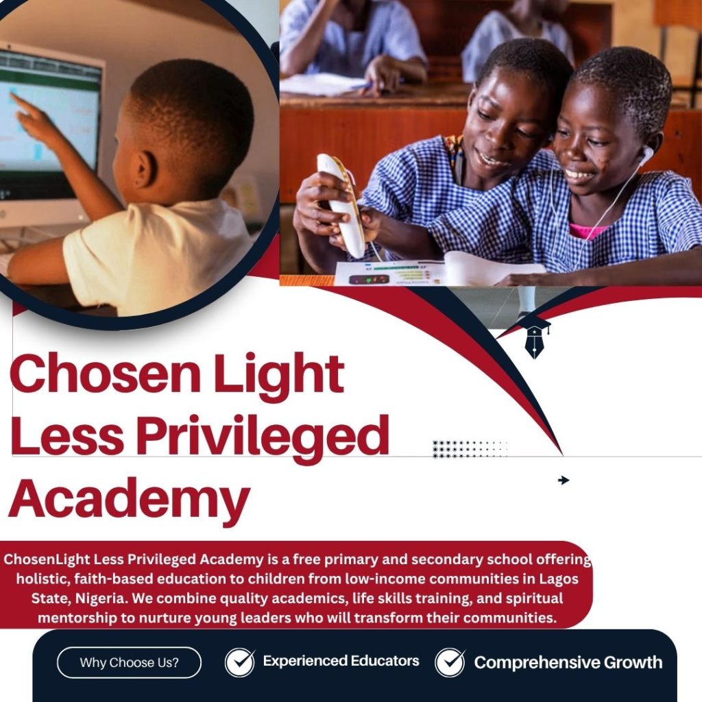 At ChosenLight Less Privileged Academy, we believe that no child should be denied a future because of poverty. Through our tuition-free education, spiritual mentorship, and leadership development, we are raising a new generation of empowered changemakers.